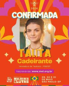 Vereadora eleita pelo PSB de Taubaté-SP, Talita Cadeirante (@talitacadeirante) é presença confirmada no Festival Nacional MEL – Mulheres em Lutas! Junte-se a esse grupo de